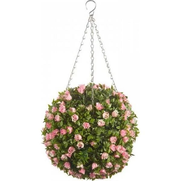 Decoratie bol die zowel kan hangen als in een plantpot past. De kunststof bol is voorzien van tal van groene blaadjes en mooie roze roosjes die net echt lijken.