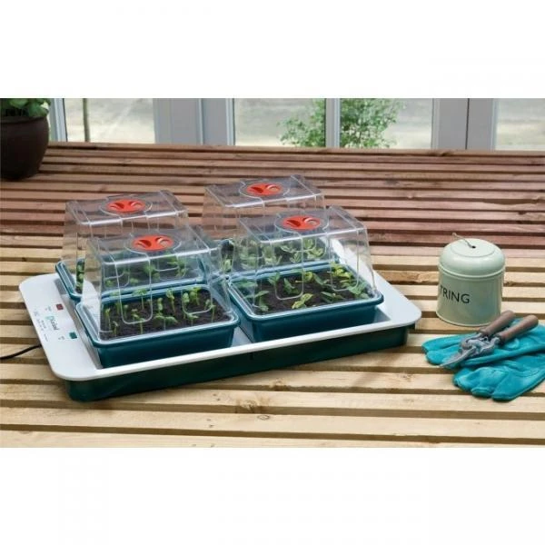 Kweek bloemen, groenten of kruiden in afzonderlijke kasjes. Deze vierdelige propagator is een complete verwarmde plantenkwekerij.
