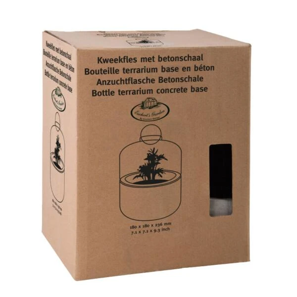Leuke kweekstolp voor het opkweken van allerlei zaden, stekjes of plantjes die van de nodige luchtvochtigheid houden. De glazen stolp past perfect op de mooi gepolijste grijze betonbasis en kan bovenaan worden afgesloten met een bijhorende betonkogel.