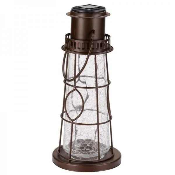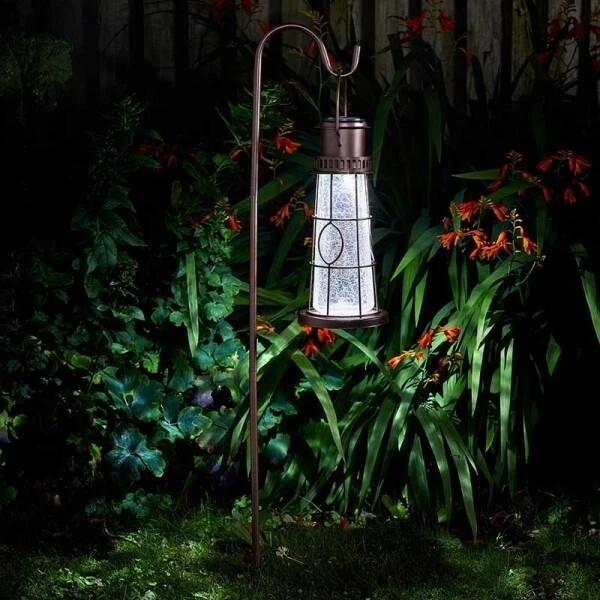 Het mooie design van de vuurtoren met gecrackeleerd glas past perfect in de tuin. Plaats de lantaarn met de grondhaak langs jouw vijver, een tuinpad, aan de deur, in een bloemperk of in een bloempot op het terras of balkon. Ook zonder haak vormt deze lantaarn een mooie decoratie op de tuintafel, het tuinpad, de vensterbank of hangend aan een pergola. Dankzij het zonnepaneel bovenop de lantaarn laadt de batterij zich op met zonne-energie en bij duister straalt er een kleurrijk licht doorheen het bijzondere glas van de vuurtoren. Extra leuk is de keuze tussen wit licht of kleur veranderend licht.